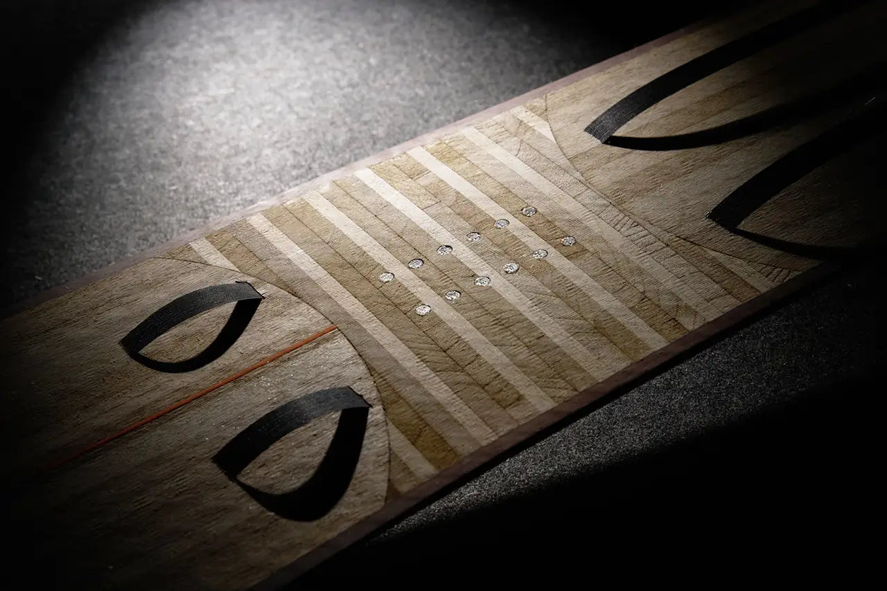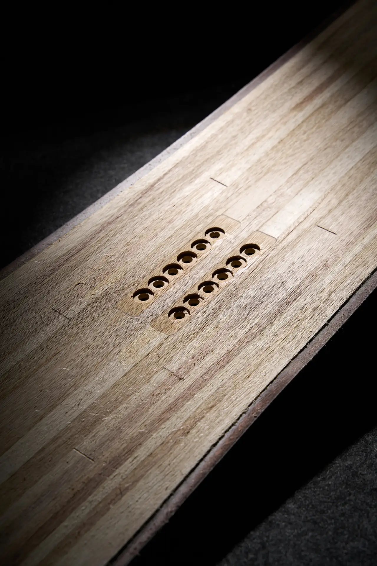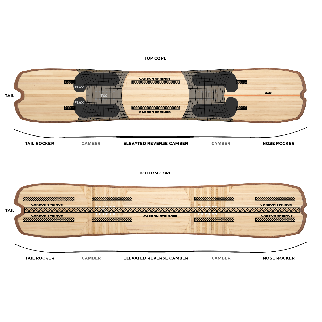 The cross grain of our TCC core (Torsion control core) enhances edge hold, stability, and impact resistance while carbon fiber woven through the core outside your front and back binding adding pop and strength.